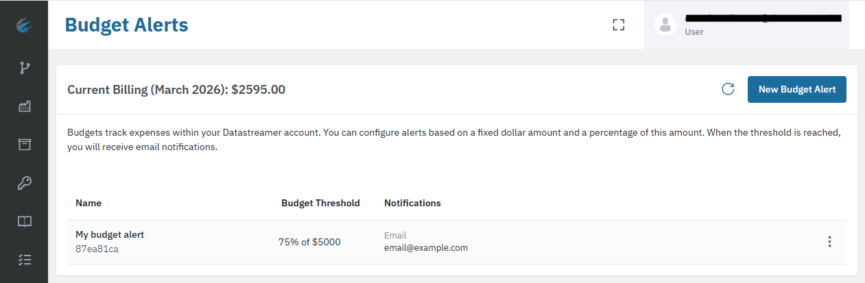 Budget Alerts help you monitor your Datastreamer spending by sending email notifications when your usage reaches specific thresholds. Get warned before exceeding your budget!