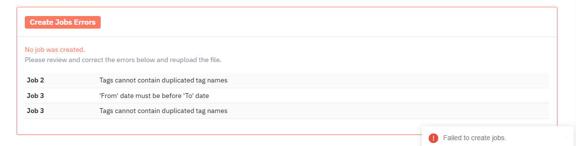 - Cause: wrong data type (using text instead of numbers), duplicated tags, inconsistent column numbers, invalid column headers, date & time format, start date is after end date or identical.
