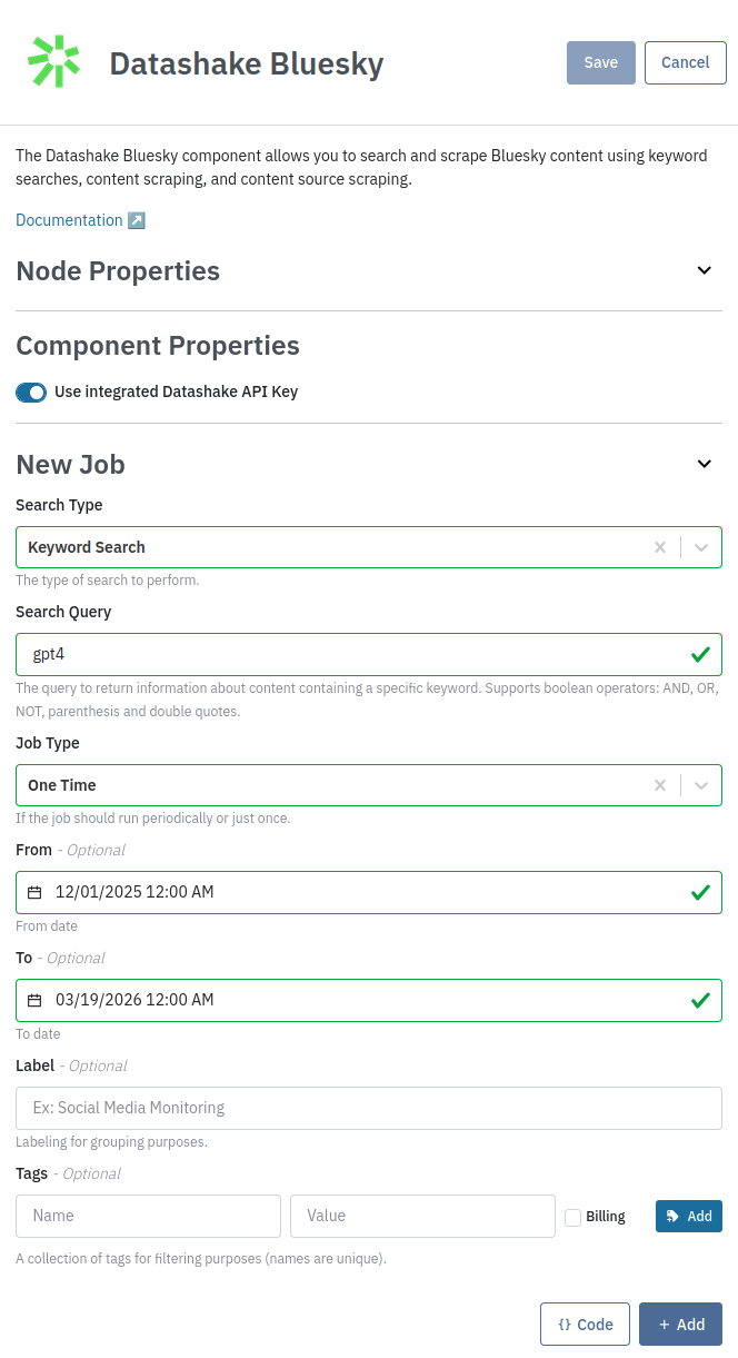 The Datashake Bluesky component allows you to search and scrape Bluesky content using keyword searches, content scraping, and content source scraping. It handles the interaction, polling, and result download; and ingresses the returned data into your pipeline.