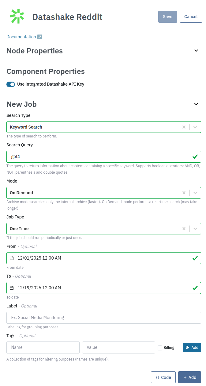 The Datashake Reddit component allows you to search and scrape Reddit content using keyword searches, content scraping, and content source scraping. It handles the interaction, polling, and result download; and ingresses the returned data into your pipeline.