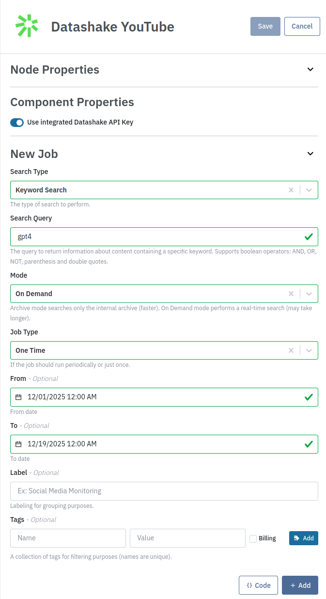 The Datashake YouTube component allows you to search and scrape YouTube content using keyword searches, content scraping, and content source scraping. It handles the interaction, polling, and result download; and ingresses the returned data into your pipeline.