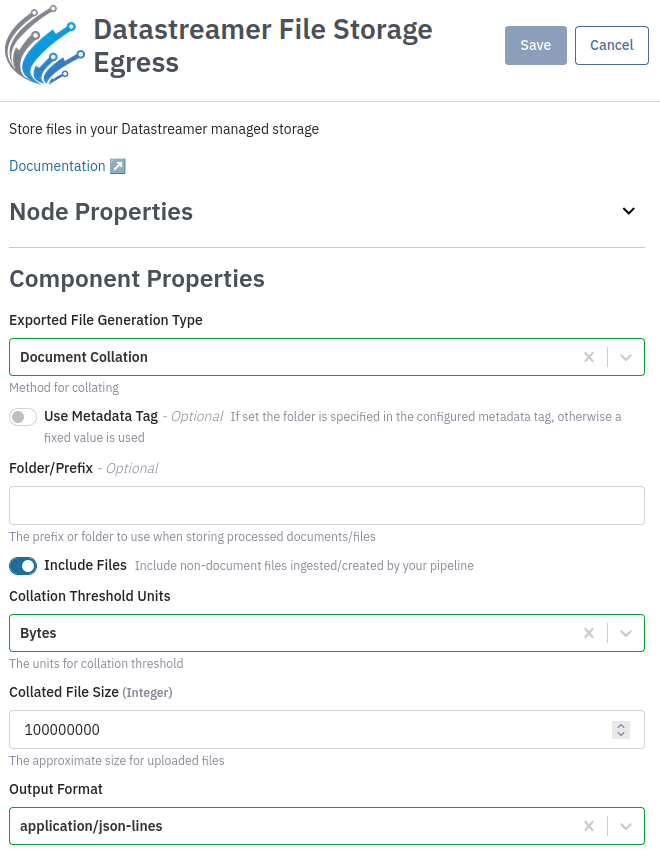 The Datastreamer File Storage Egress component allows you to create files in Datastreamer Storage from your Pipeline documents, with options to customize file creation