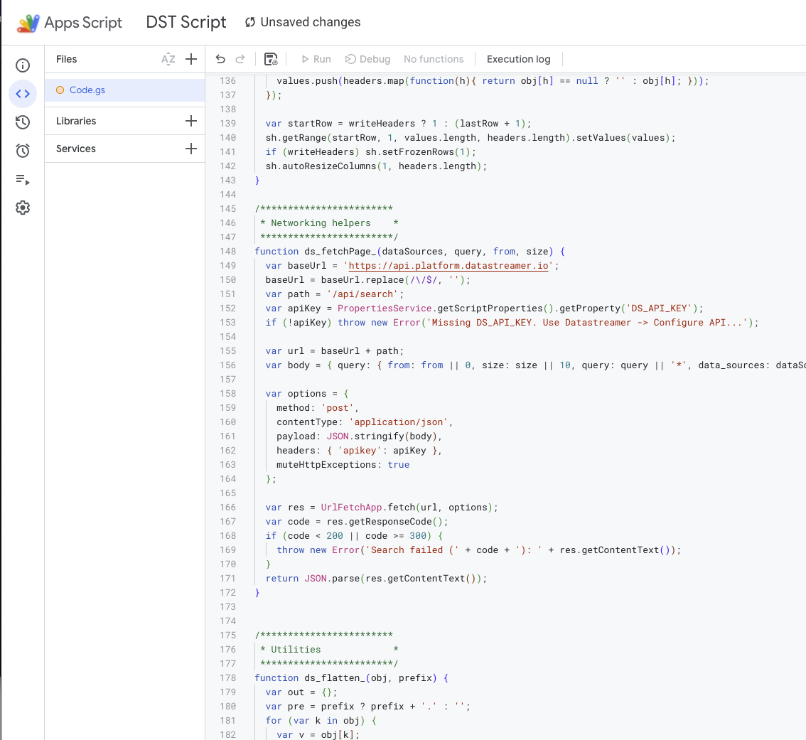 * Datastreamer Search -> Google Sheets (Apps Script)