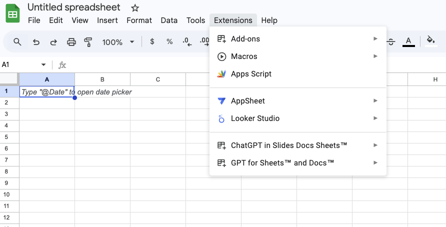 From within a new Google Sheet, select "Extensions" and then "Apps Script".